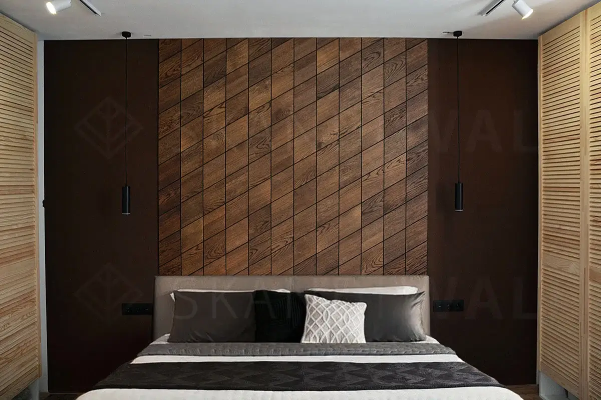 Дерев’яна плитка Rhombus створює елегантну геометричну композицію з ромбів. Ромби вироблені з натурального шпону дуба, вкритого олією-воском, щоб підкреслити красу дерева. Перевага плитки Rhombus в тому, що її можна викладати в різних варіаціях, кардинально змінюючи композицію та загальний вигляд на стіні.