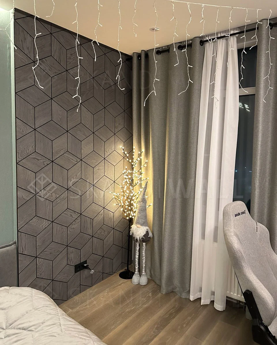 Дерев’яна плитка Rhombus створює елегантну геометричну композицію з ромбів. Ромби вироблені з натурального шпону дуба, вкритого олією-воском, щоб підкреслити красу дерева. Перевага плитки Rhombus в тому, що її можна викладати в різних варіаціях, кардинально змінюючи композицію та загальний вигляд на стіні.