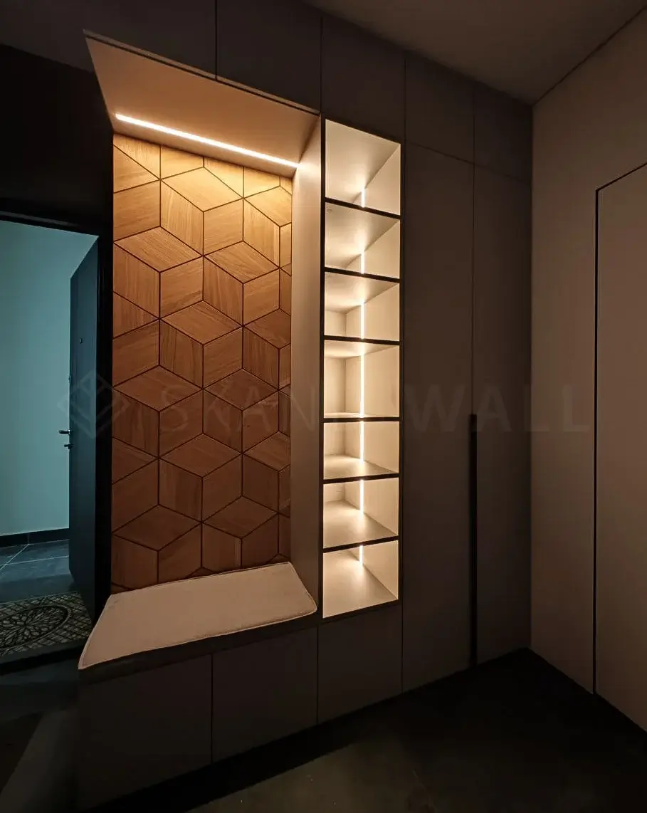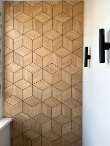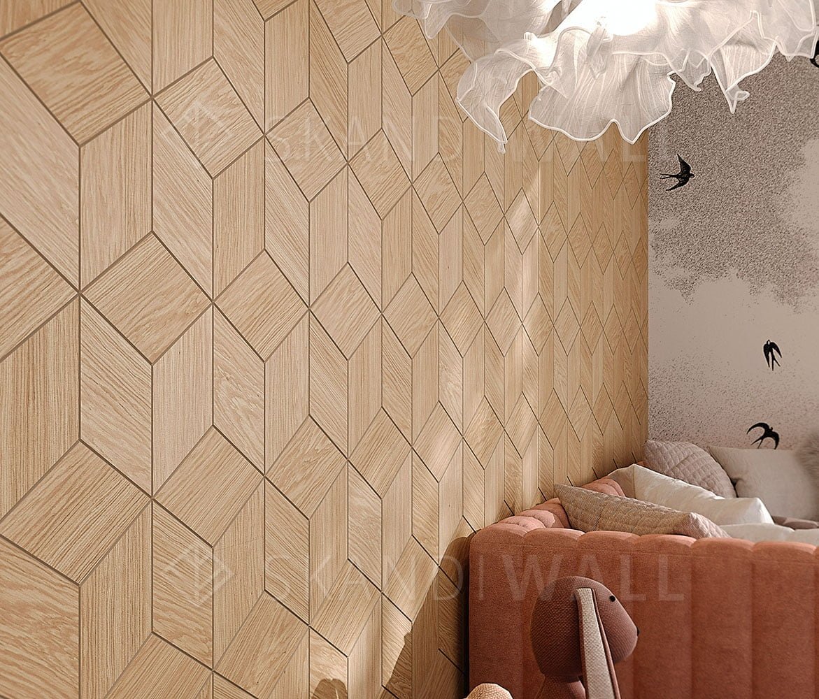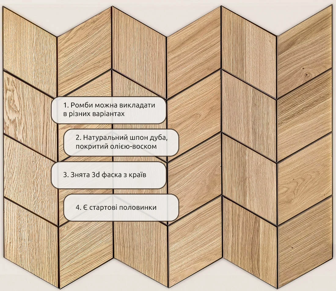 Дерев’яна плитка Rhombus створює елегантну геометричну композицію з ромбів. Ромби вироблені з натурального шпону дуба, вкритого олією-воском, щоб підкреслити красу дерева. Перевага плитки Rhombus в тому, що її можна викладати в різних варіаціях, кардинально змінюючи композицію та загальний вигляд на стіні.