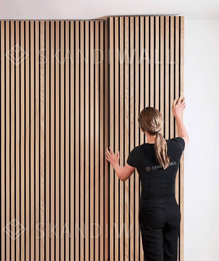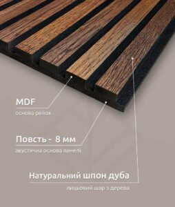 Рейки виготовлені з натурального шпону дуба та покриті олією Borma (Італія). У виробництві ми використовуємо тільки натуральні матеріали, щоб ви могли відчути справжнє дерево. Шпон дуба – це шар дерева, який приклеюється до основи з МДФ. Така структура рейки забезпечує ідеальну геометрію рейок.