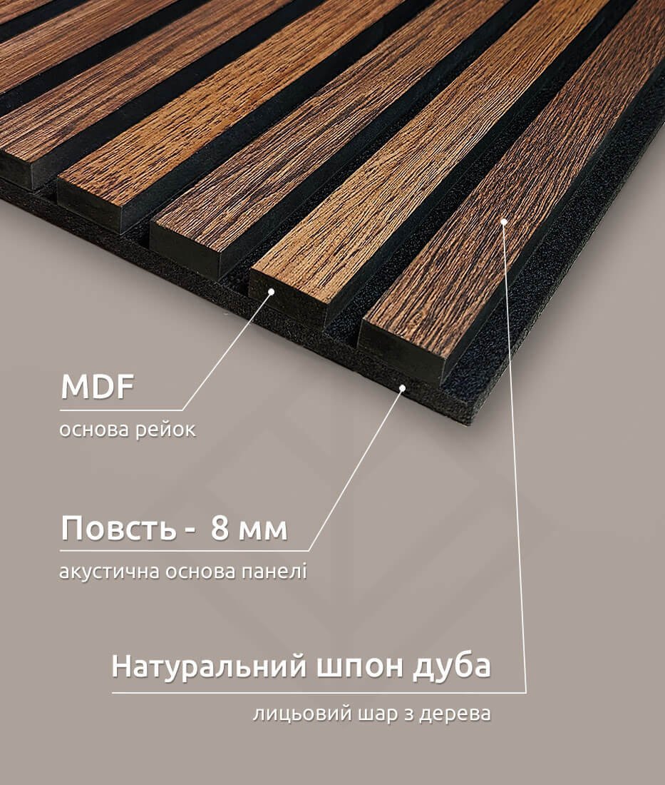 | Матеріали | Рейки: натуральний шпон дуба на МДФ основі. Основа: акустичний войлок. | |