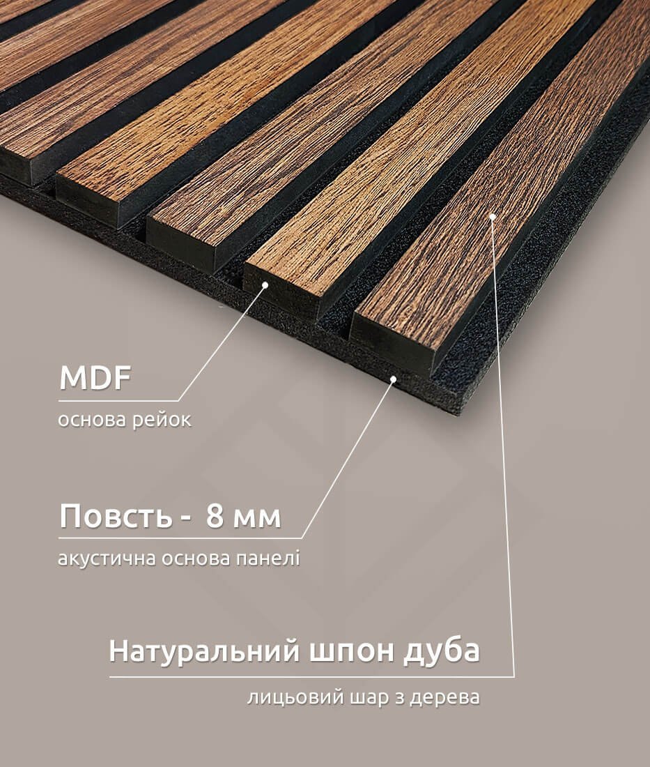 Чудовий вигляд натурального дерева – рейки вироблені зі шпону дуба та покриті масло-воском. Основа панелі – акустичний войлок.