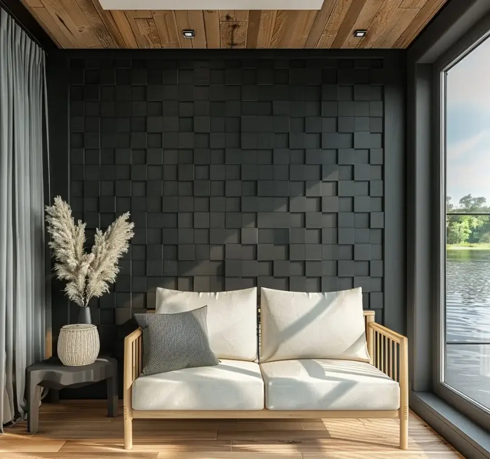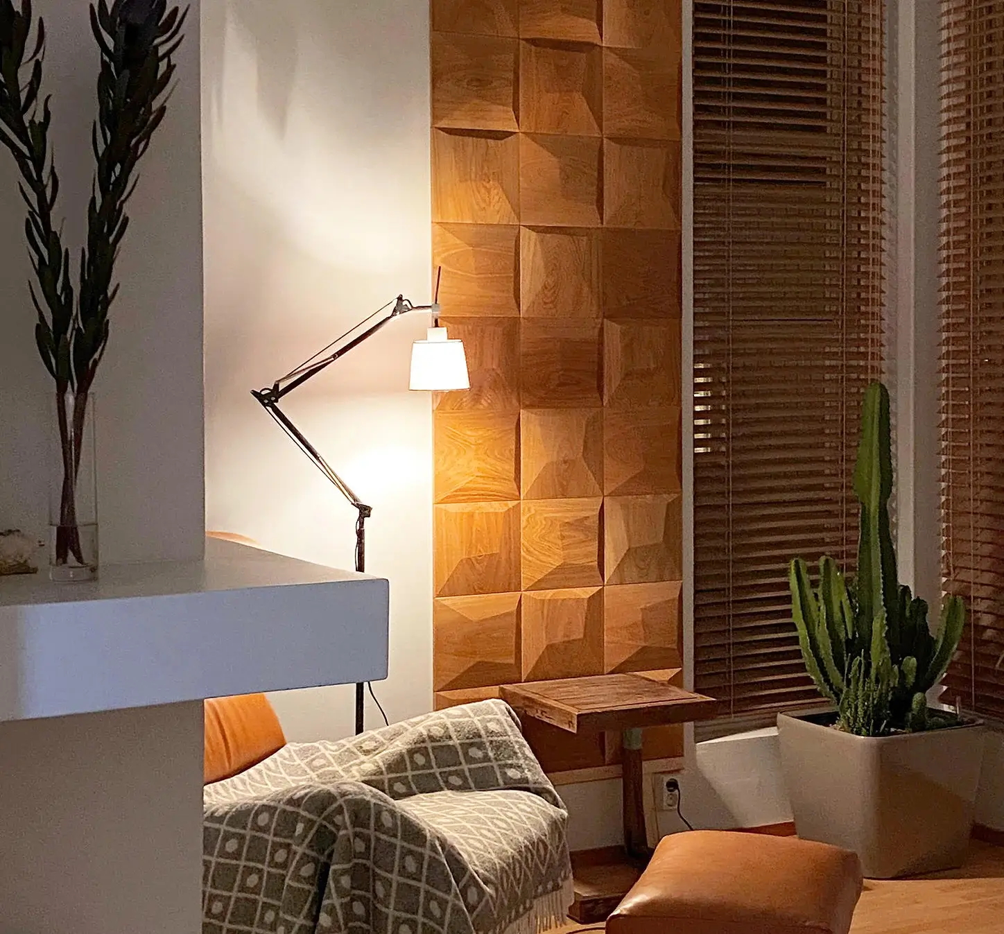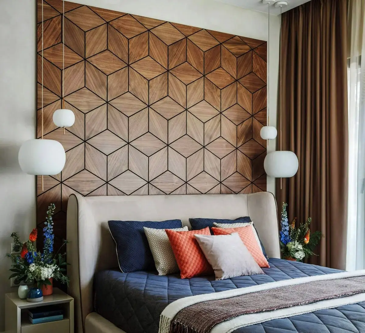 Дерев’яна плитка ідеально підходить для створення акцентних стін у вітальнях, спальнях, кабінетах і навіть ванних кімнатах. Геометричні візерунки з дерева можуть бути використані як для оформлення всієї стіни, так і для виділення окремих зон, таких як узголів’я ліжка або акцентна зона за диваном.