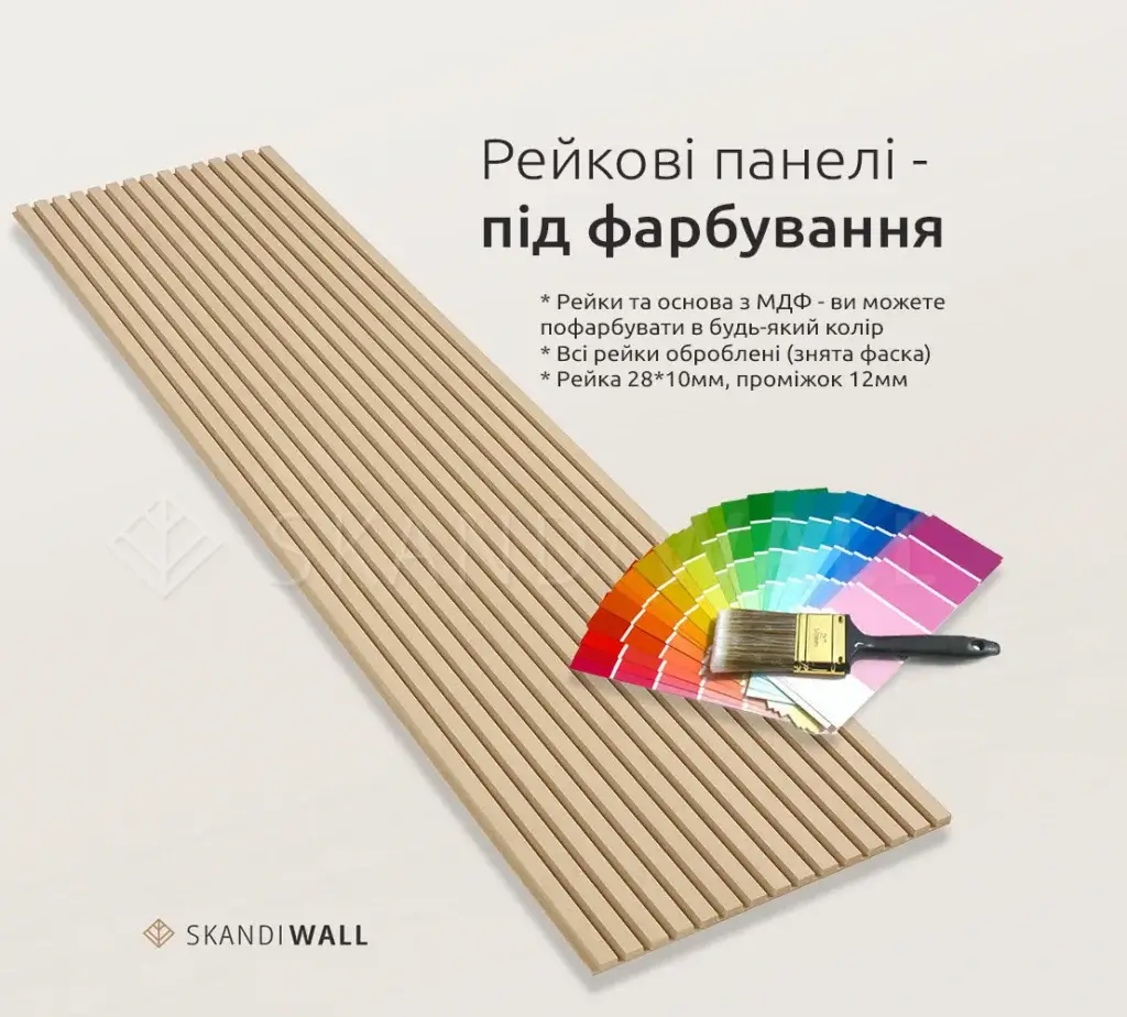 Рейки изготовлены из МДФ без покрытия - специально для дальнейшей покраски в любой цвет. Эта модель идеально подходит для дизайнеров, строительных фирм и тех владельцев, которым важно подобрать цвет в соответствии с дизайнерским замыслом. Рейки толщиной 10мм произведены из МДФ, имеют отличную геометрию и обработаны вдоль - снята фаска. Рейки собраны на основе из МДФ 6мм.